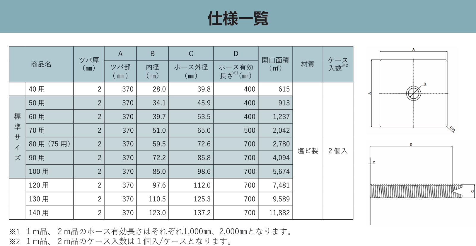 | 材質 | ツバ部 : 軟質塩ビ 筒部 : 軟質塩ビ / 塩ビホース |